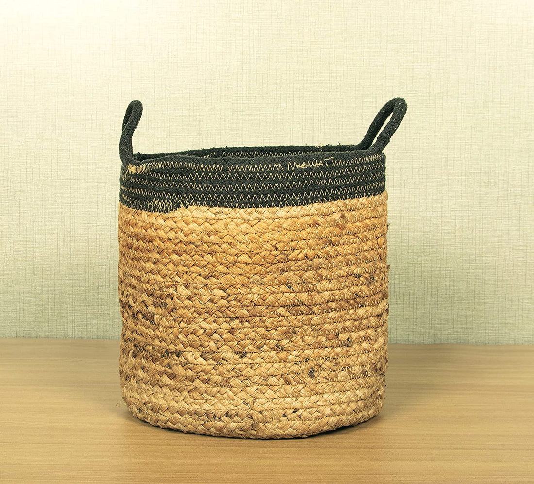 TIB The Intellect Bazaar jute Planter Pots/Handcrafted Storage Basket with handle, Multi-Purpose use for Living Room (12x12 Inches)Beige and Black Color